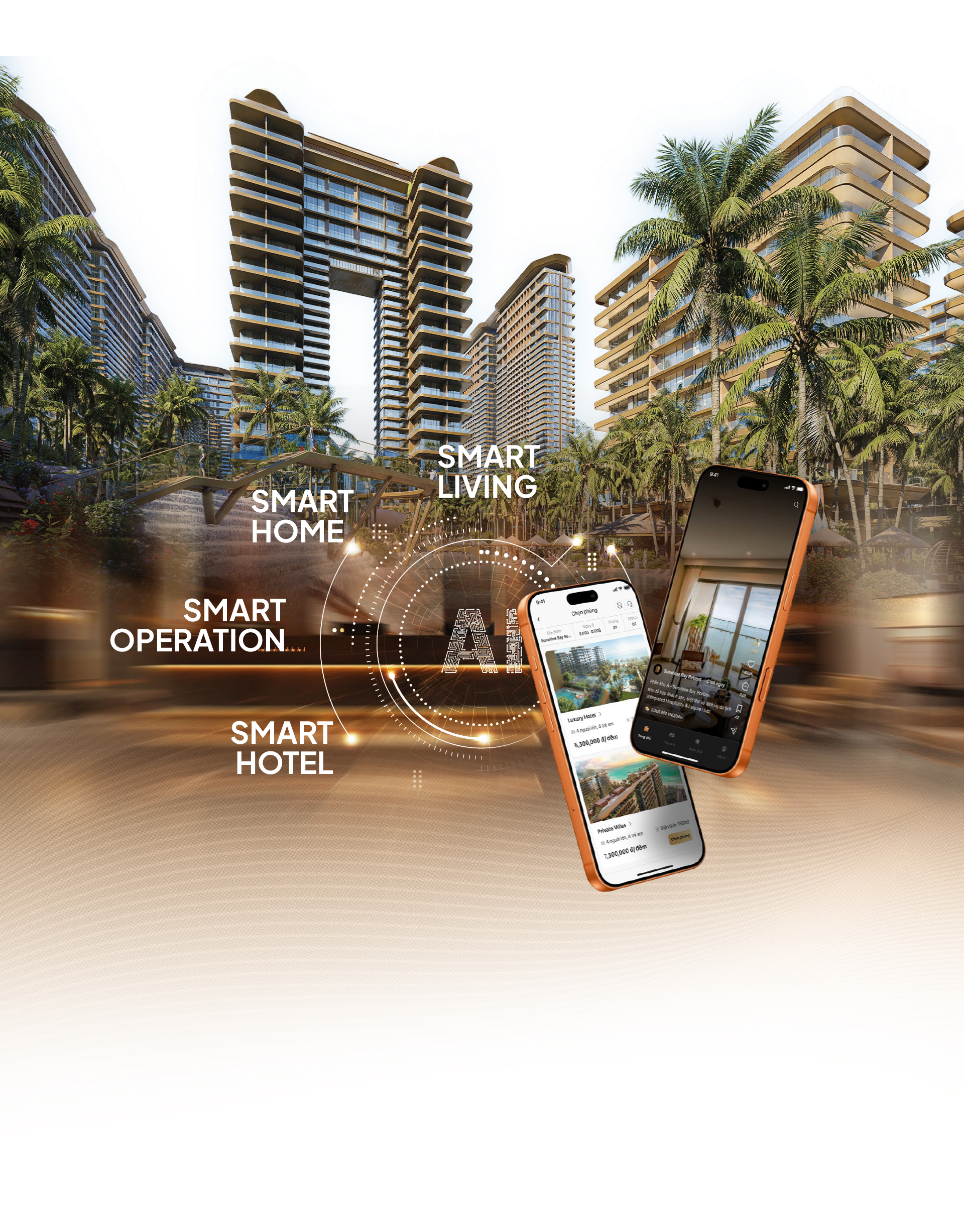 Toàn bộ dự án được vận hành theo mô hình thông minh, ứng dụng công nghệ 4.0 và AI vào mọi khía cạnh: từ quản lý năng lượng, an ninh, chiếu sáng đến vận hành Smarthome - Smart Hotel. Khách hàng có thể điều khiển thiết bị bằng giọng nói hoặc app, check-in/check-out tự động qua FaceID, đặt dịch vụ nhanh chóng và nhận các gợi ý cá nhân hóa theo sở thích nhờ AI & Big Data. Hệ thống an ninh thông minh và quản lý năng lượng hiệu quả cũng góp phần mang đến trải nghiệm sống an toàn, bền vững và hoàn toàn khác biệt.