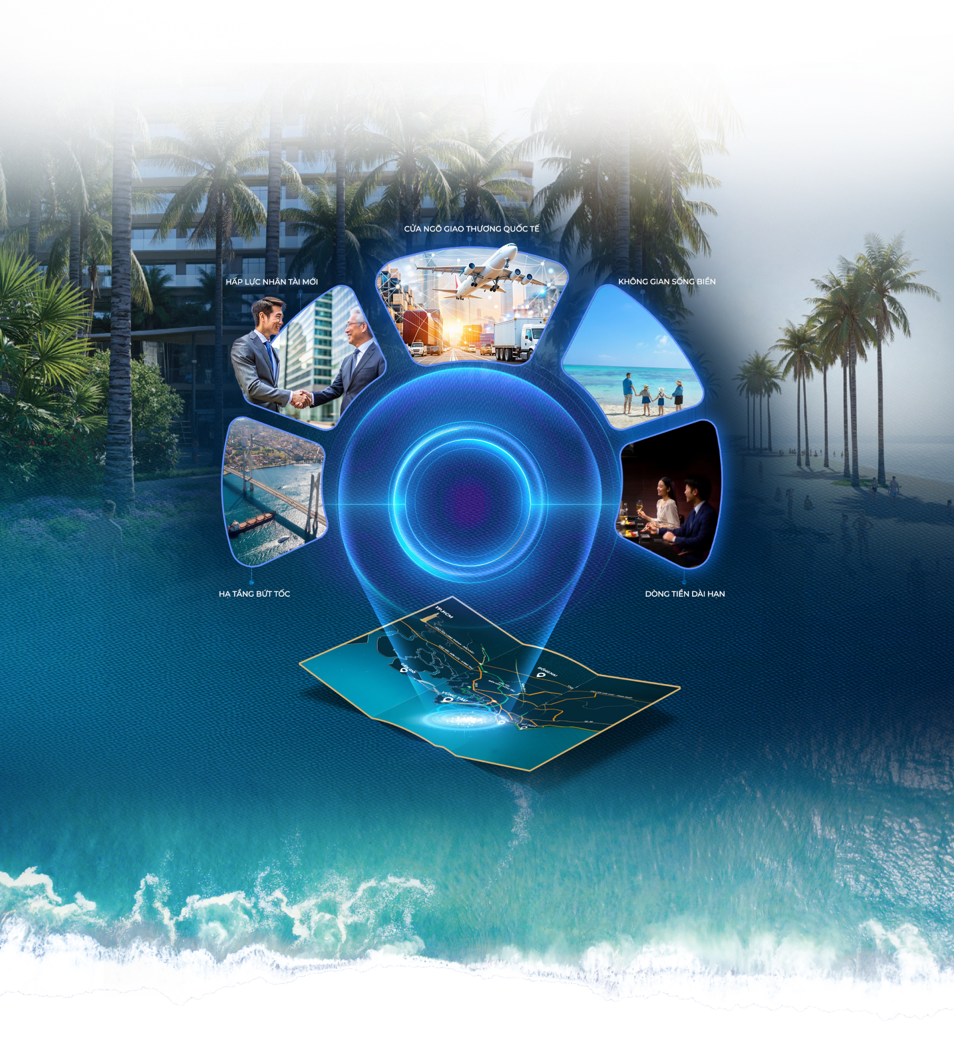 Vượt trên giá trị nghỉ dưỡng, dự án còn nằm trong vùng hưởng lợi trực tiếp từ hệ sinh thái công nghiệp - logistics lớn nhất phía Nam. Sự cộng hưởng giữa cụm cảng nước sâu Cái Mép - Thị Vải, siêu dự án Cảng trung chuyển quốc tế Cần Giờ và Sân bay Quốc tế Long Thành tạo nên thế kiềng ba chân "Cảng biển - Logistics - Hàng không". Xung lực kinh tế này không chỉ thúc đẩy dòng vốn, thương mại và du lịch, mà còn bảo chứng cho giá trị tăng trưởng bền vững của một Skyline đẳng cấp quốc tế tại Vũng Tàu.