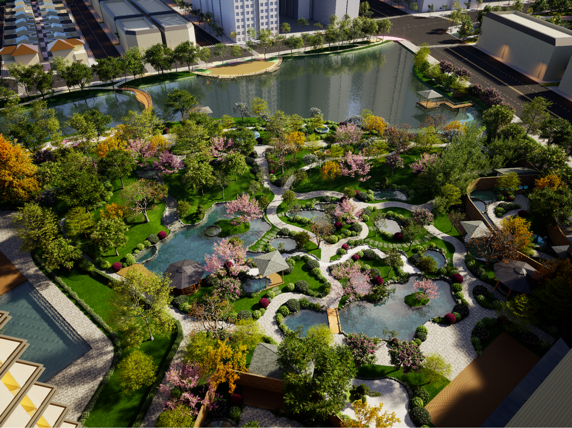 Đáng chú ý, các tòa tháp tại Alumi được quy hoạch theo trục hướng sông, với tỷ lệ kỷ lục 100% khối tháp đón được dòng khí lưu chuyển Bắc – Nam, tạo nên vi khí hậu mát lành hơn 3–5°C vào mùa hè, đồng thời tối ưu ánh sáng tự nhiên và tầm nhìn thoáng rộng. Hệ cảnh quan với cây xanh xen tầng, mặt nước đan cài, phản ánh lối thiết kế hướng tự nhiên (Biophilic Design) trong triết lý bất động sản năng lượng, giúp cư dân luôn cảm nhận được sự thư thái và cân bằng ngay giữa nhịp sống đô thị hiện đại.