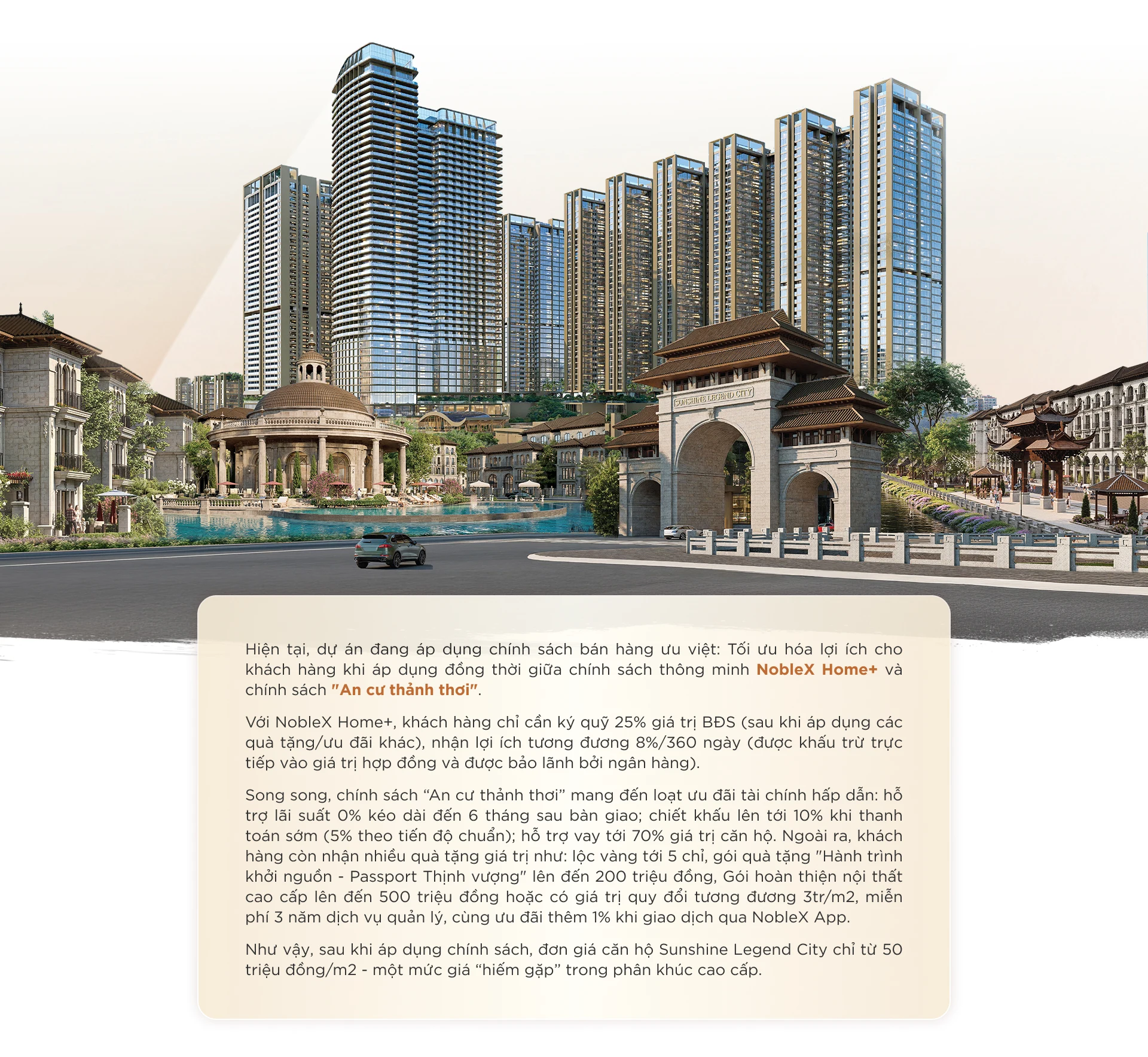 Trên quy mô gần 50ha, Sunshine Legend City phát triển gần 8.000 căn hộ cao cấp cùng gần 700 dinh thự, nhà phố mang cảm hứng thương cảng Phố Hiến sầm uất. Không dừng lại ở việc bảo tồn di sản qua các không gian nghệ thuật và lễ hội đặc sắc, dự án còn tiên phong kiến tạo hệ sinh thái giải trí, thể thao và kết nối cộng đồng cho thế hệ cư dân trẻ toàn cầu. Tại đây, di sản không chỉ để soi chiếu mà đã thực sự trở thành bệ phóng vững chãi, khơi nguồn trải nghiệm sống rực rỡ cho cộng đồng cư dân đa thế hệ.