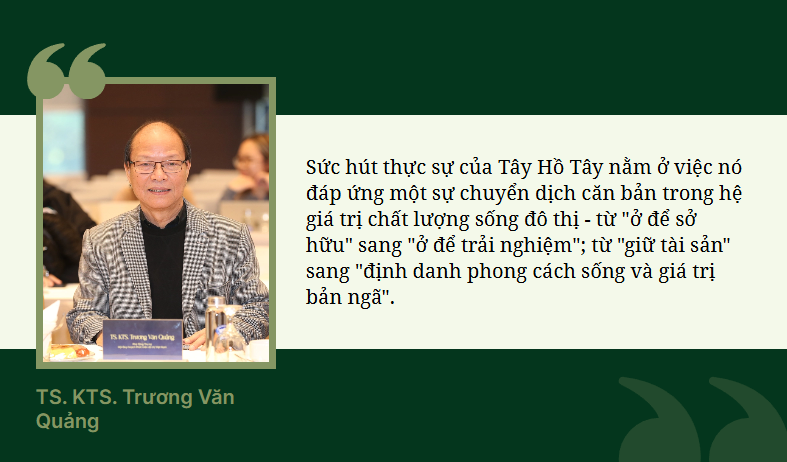 Ở góc độ quy hoạch và xã hội học đô thị, TS. KTS. Trương Văn Quảng cho rằng, nếu chỉ nhìn Tây Hồ Tây qua lăng kính hạ tầng hay quy hoạch là chưa đủ. Sức hút thực sự của khu vực này nằm ở việc nó đáp ứng một sự chuyển dịch căn bản trong hệ giá trị chất lượng sống đô thị – từ “ở để sở hữu” sang “ở để trải nghiệm”; từ “giữ tài sản” sang “định danh phong cách sống và giá trị bản ngã”.