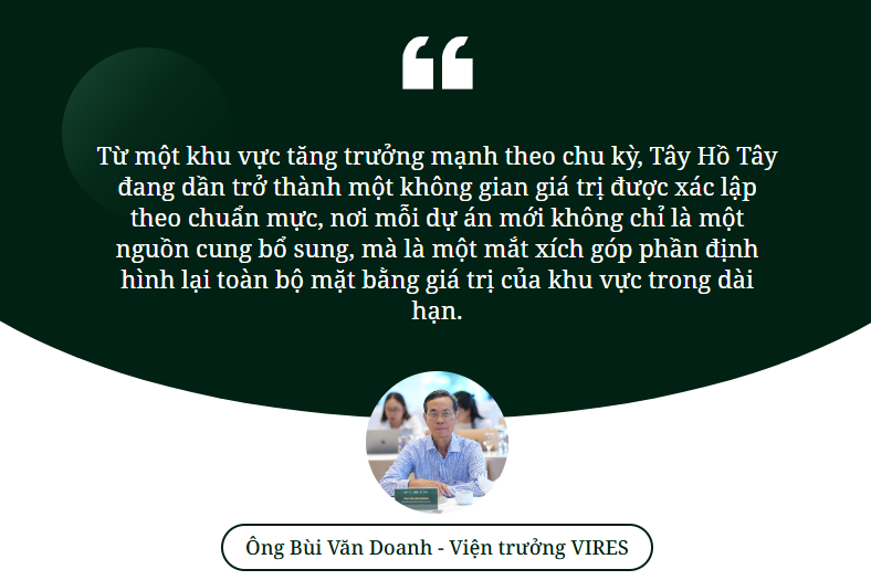 Theo ông Bùi Văn Doanh, Viện trưởng Viện Nghiên cứu Bất động sản Việt Nam, chính sự chuyển dịch này đã làm thay đổi căn bản vị thế của Tây Hồ Tây trong cấu trúc thị trường bất động sản Hà Nội. Từ một khu vực tăng trưởng mạnh theo chu kỳ, Tây Hồ Tây đang dần trở thành một không gian giá trị được xác lập theo chuẩn mực, nơi mỗi dự án mới không chỉ là một nguồn cung bổ sung, mà là một mắt xích góp phần định hình lại toàn bộ mặt bằng giá trị của khu vực trong dài hạn.