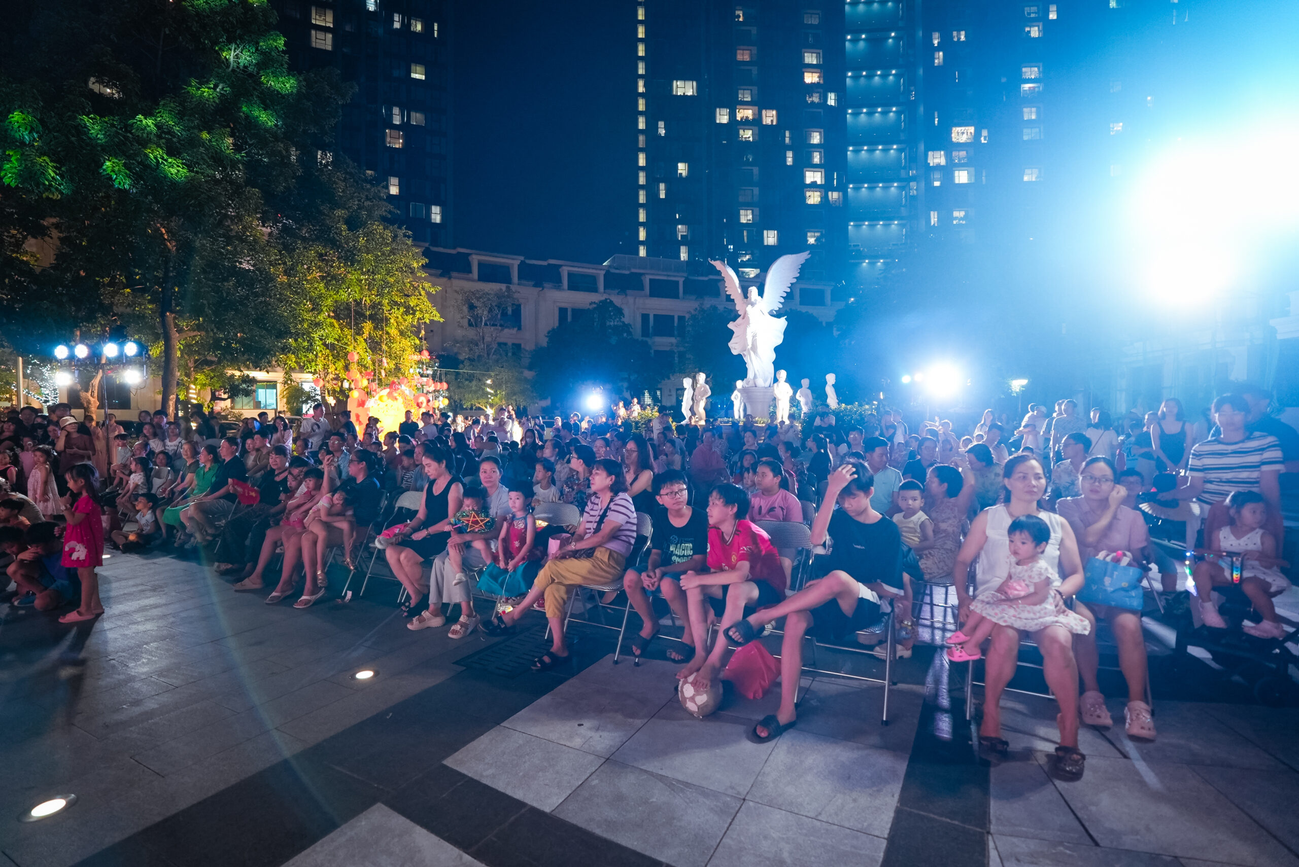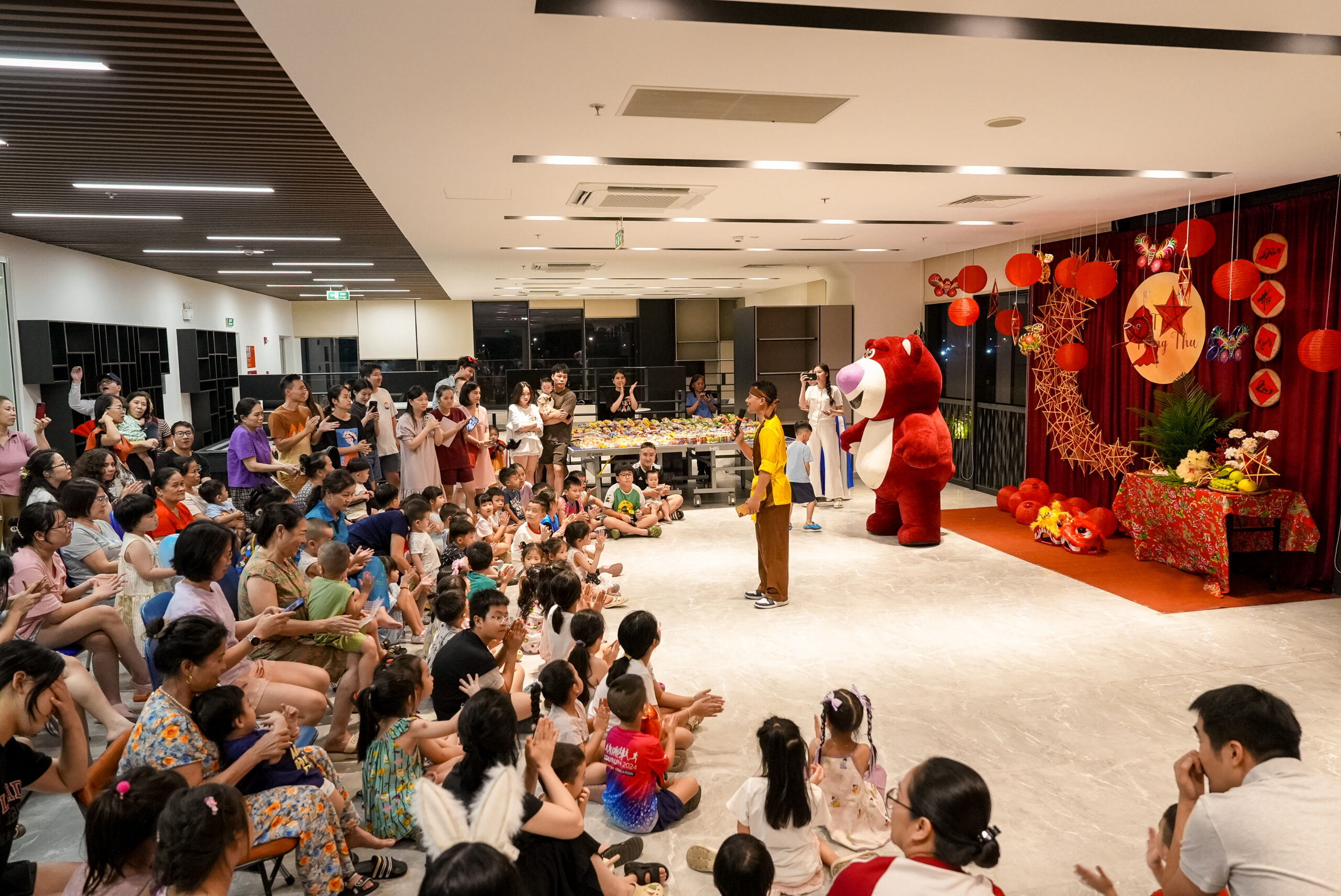 Và rồi đêm Rằm Trung Thu cũng đến, khắp không gian khuôn viên rộn ràng tiếng trống hội và sắc màu rực rỡ của màn múa lân – sư – rồng mở màn cho đêm hội. Tiếp nối là chuỗi hoạt động tương tác dành cho các cư dân nhí như kéo co, tô tượng, đố vui dân gian… – những trò chơi quen thuộc nhưng đầy hứng khởi, giúp các em vừa thỏa sức vui đùa, vừa thêm hiểu và trân quý những giá trị văn hóa truyền thống.