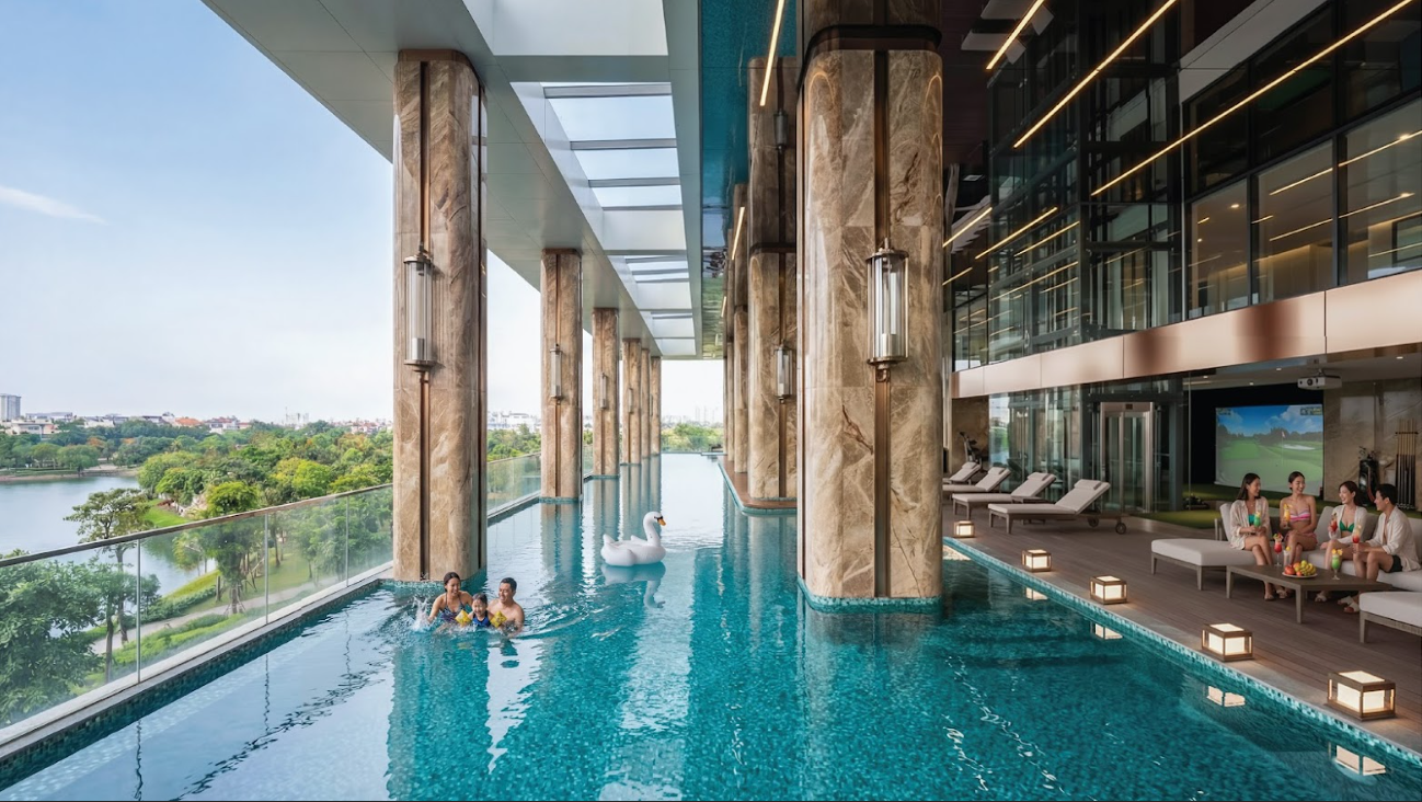 Tại tầng 3 của 2 tòa tháp đều có khu bể bơi với diện tích 1431 m² và 1883 m², với diện tích mặt nước lần lượt là 500 m² và 666 m², hình thành không gian thư giãn và tái tạo năng lượng cho cư dân và khách hàng