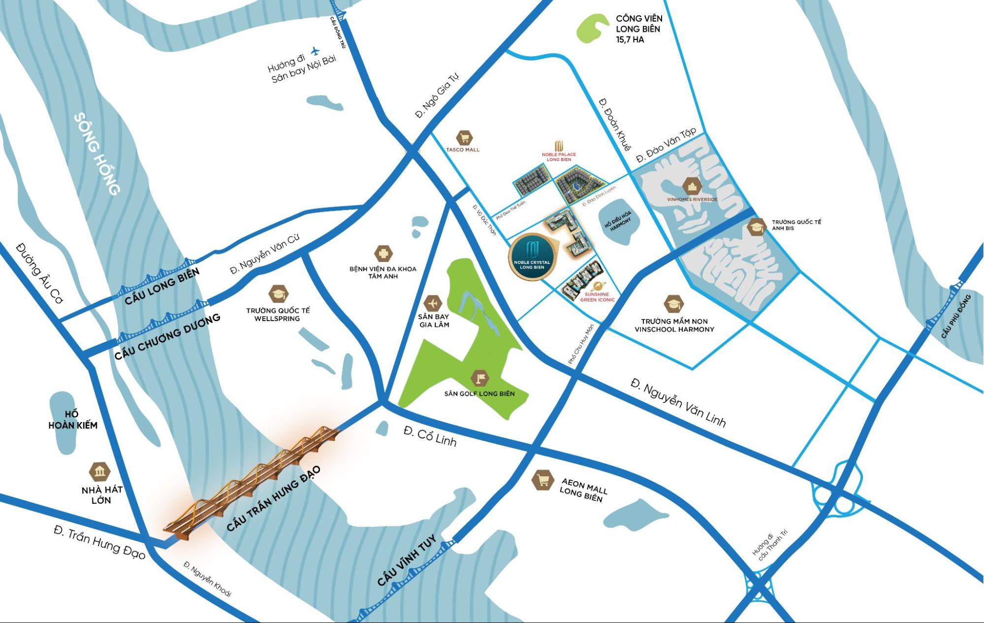 Về mặt quy hoạch, Noble Crystal Long Bien WorldHotels Residences nằm đúng giao điểm của các trục giao thông chiến lược: đến Hoàn Kiếm qua cầu Trần Hưng Đạo, Chương Dương, Long Biên, Vĩnh Tuy; xuống Hoàng Mai và phía Nam qua cầu Thanh Trì; và kết nối hành lang Đông – Tây từ Hà Nội đến Hưng Yên, Hải Phòng. Đây là tọa độ thường được giới đầu tư mô tả là “giao điểm vàng của dòng vốn”, nơi nhu cầu ở thực và đầu tư đều bứt phá mạnh mẽ theo mức độ hoàn thiện hạ tầng.