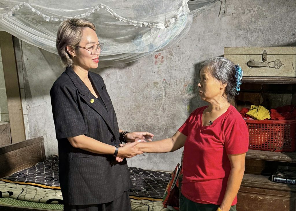 Chị Kiều Bích Ngọc – Đại diện Sunshine Group trò chuyện cùng bà của Yên trong căn nhà nhỏ tại Nghệ An.